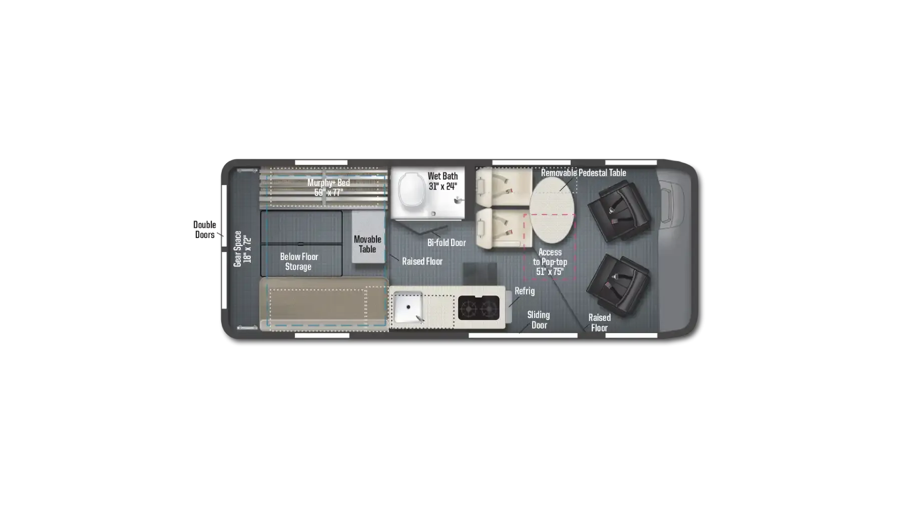 Up to four people can sleep comfortably, with a primary bed and pop-top loft available.