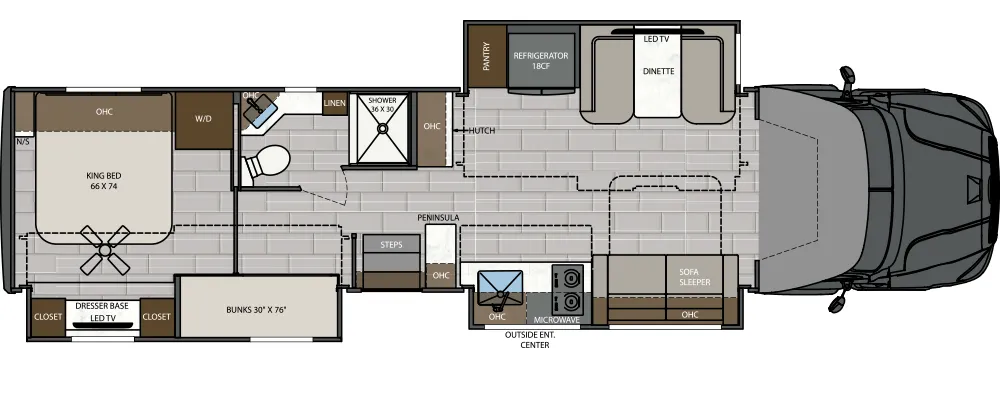 The bathroom is built for everyday comfort with upgraded tile finishes, sleek fixtures, and a molded shower topped by a skylight. Vent fans keep the space open and fresh, while bright cabinetry provides storage for everything you need. It’s practical enough for life on the move yet modern enough to feel refreshing at the end of every day.