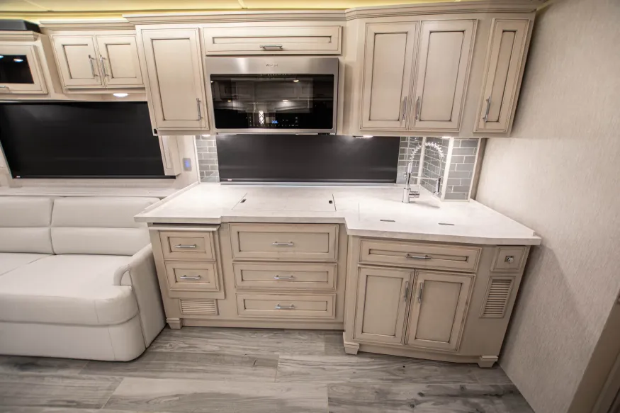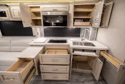 At 29 feet to 45 feet long, Class A RVs are a popular choice for people seeking to take an adventure in a motorhome. Class A Motorhomes can fit large groups of people and feature open, comfortable floorplans and amenities that you’d find in an apartment or home. Class A RVs are a good purchase for people seeking long-term trips in a luxurious recreational vehicle.